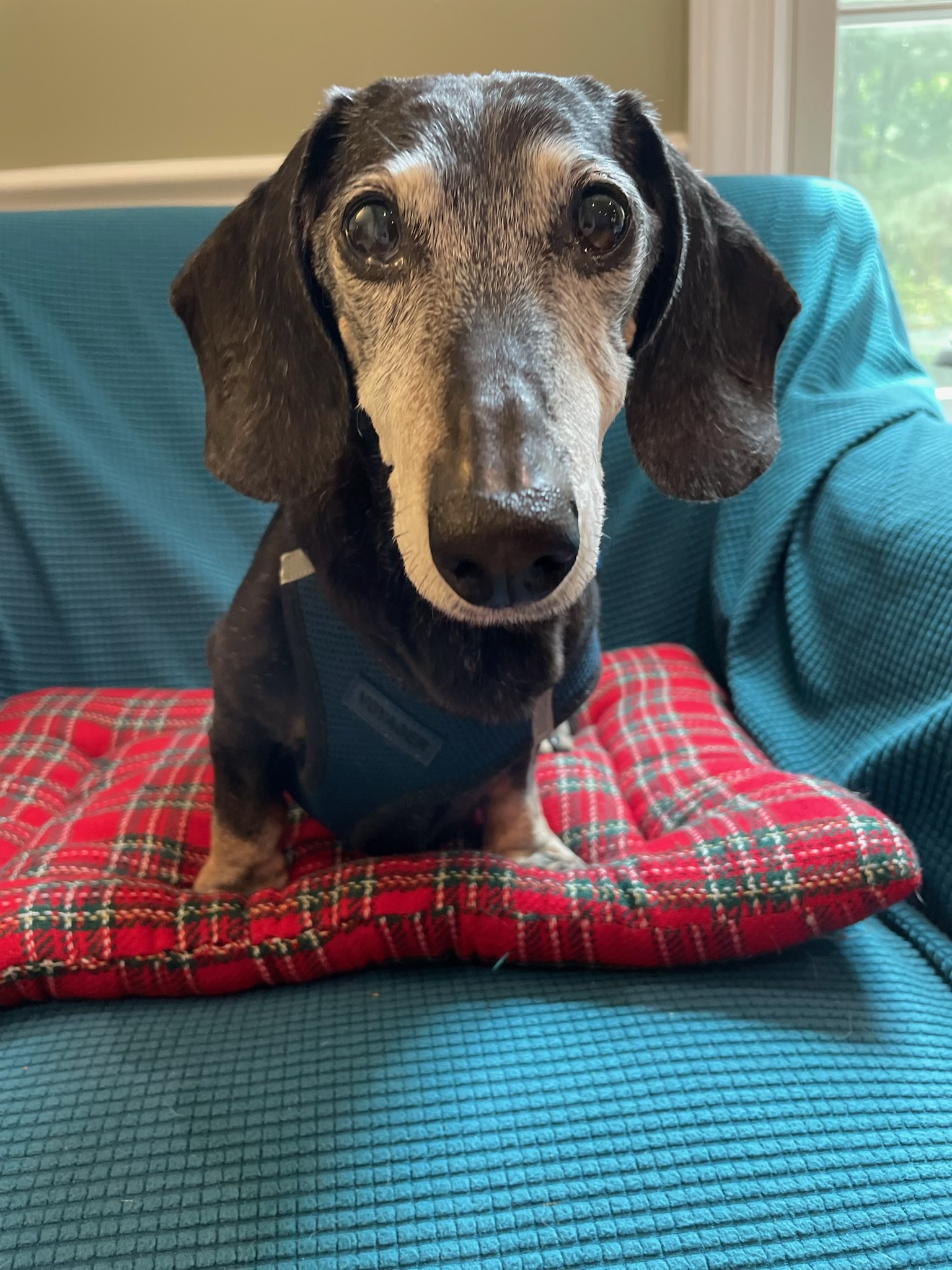 Skippy: 15-year-old Skippy joined the Leashes End family in June 2024. His owner passed away and her grandson asked us to look after the old guy. Skippy was a burrower by night and a pacer by day. Every day, this short-legged sentry marches up and down the fence line on patrol. It’s a nervous habit that he shared with some of our other seniors, like Dori. At night, Skippy dove under the covers and pressed up against my feet! He was quiet and gentle and kept to himself … unless someone called walkies and then he was part and parcel of the pack. Sadly, Skippy passed away in July, 2024 shortly after we got him. No one realized how sick he had been. There’s no doubt that he’s back with his original owner in heaven. Rest peacefully, Skippy. May your memory be a blessing.