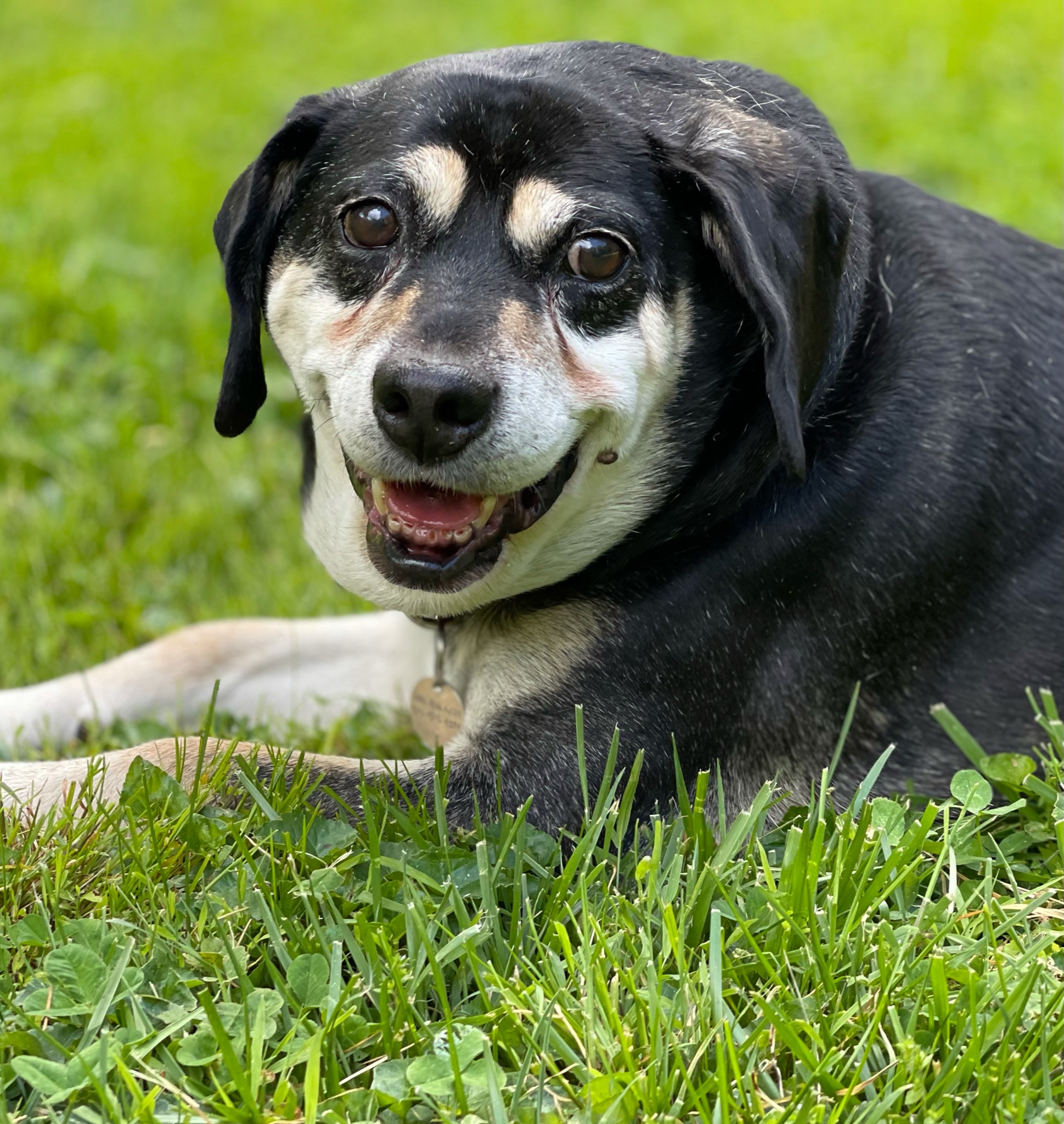 Moose: On the evening of 10 April 2023, we helped our precious 12-year-old Moose across the bridge. Moose was my Big Baby. He had an absolutely wretched life prior to rescue and I only hope that we were able to make it up to him in his final years at Leashes End. Moose joined Leashes End on September 12, 2020. He had been languishing at the Raleigh Humane Society in West Virginia for months, after being turned in as a stray … for the umpteenth time in his life. Moose was incontinent as a result of an old back and hip injury, which also caused lameness in his back paws. The orthopedic surgeon who treated Moose opined that someone shattered Moose’s lower spine and left hip with a baseball bat; probably the same someone who shot Moose with an air rifle, leaving a pellet lodged in his lung. By the time we let him go, Moose was barely ambulatory and was struggling to breathe due to pulmonary fibrosis. Despite all this, Moose was about the friendliest, most easy-going dog you could ever meet. He was calm and affable with the other dogs and cats. He shared a special friendship with tiny Mouse and never complained when tiny Walter sat on him as if he were a sofa! He wore a perpetual good-natured smile and he LOVED chicken and treats. But mostly, Moose loved being loved … he loved belonging to a family, getting to be an indoor dog, and especially getting to sleep in bed with his Mom and canine siblings at night. We will miss you forever, Moose. Rest In Peace and may your memory be a blessing, Z”L.