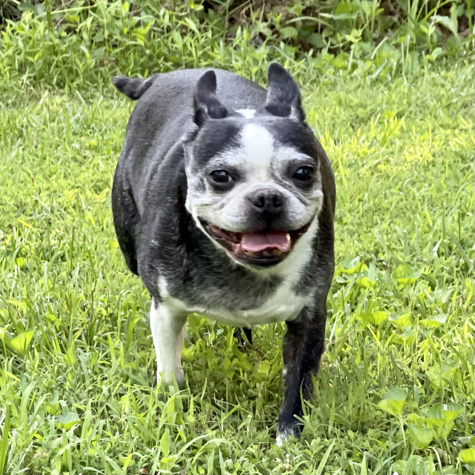 Chica: In early May 2023, we said goodbye to our charismatic, 14-year-old Boston Terrier Chica. Chica had developed a pea-sized bump on her rump. Aspirated cells indicated an inoperable mast cell tumor. We were hardly prepared for how aggressively it would grow. Within a month, the tumor had grown so large that it burst, leaving a painful wound, which we could not treat or keep clean. Sadly, we had no choice but to let Chica go. Chica had joined the Leashes End family in April, 2022 with her bonded “sister” Sadie Puggle (RIP). Now Chica and Sadie are together once more. Chica could be pushy about attention, treats, & scritches. She would sass you & talk back. She loved walks, lumbering along with the pack with her barrel-shaped body. She loved rolling in the grass, waving her legs aloft, grunting & snorting her delight. And she loved sleeping close in bed at night, even sharing my pillow, shamelessly snoring and farting the night away. Toward the end, she slept by my side every night, and I held her close, flatulence and all. May her memory be a blessing, Z”L.
